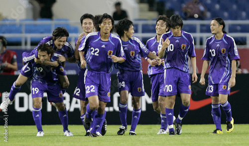 Japan Players Celebrate After Scoring Against Qatar During Their